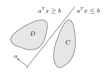 超平面分割定理。直觉上非常明显的定理。如果 $C$ 和 $D$ 是两个不相交凸集,那么必然存在向量 $a\ne0$ 和 $b$ 使得:$a^Tx\le b$ 对 $\forall x\in C$ 成立,$a^T x\ge b$ 对 $\forall x\in D$ 成立。感性理解如下图: