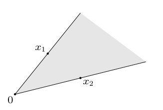 锥组合(Conic Combination)的定义:对于任意两个相异点 $x_1,x_2$,任何可以由 $x=\theta_1x_1+\theta_2x_2,\space \theta_1,\theta_2\ge0$ 表示的点,所构成的集合称为 $x_1,x_2$ 的锥组合。