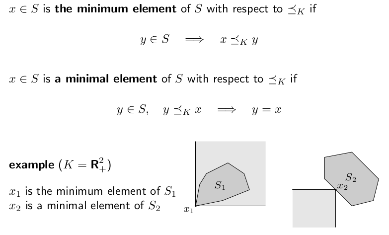 如上图,在 $\mathbf{R}^n_+$ 中,凸集 $S_1$ 的最小元素是 $x_1$,因为它可以在 $R^n_+$ 上与其他任何元素比较(即凸集代表的图像全部包含在阴影部分区域内),并且它比所有元素都小;