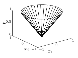 这里范式锥的定义实际上是 上境图(epigraph),因为 $t$ 和 $x$ 不是等号关系(函数关系),而是:$||x||\le t$;因此表示的是如下图锥(实心);