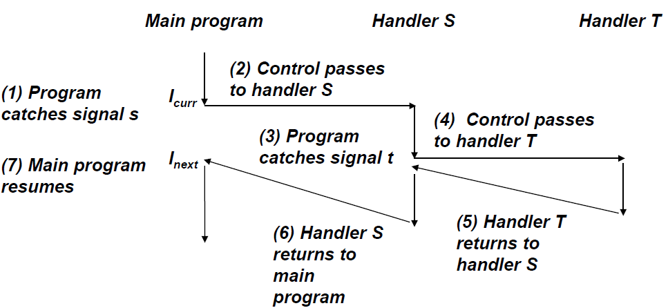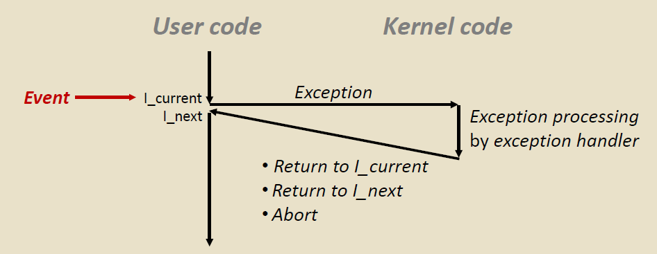 如图所示,因为以上的事件(event)而改变了系统状态,执行到 $I_{current}$ 的用户代码被立即暂停,此时 exception 将控制权从用户代码转移到内核态代码。这部分内核代码被称为 exception handler(异常处理程序);