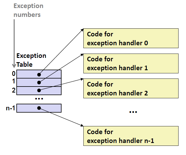 OS 为了将每种 Event 产生的 Exception 与 Exception Handler 对应起来,将每种类型的事件进行编号。每种类型的事件对应位于的 异常编号(Exception Number,又称为中断向量,Interrupt Vector),这个编号被作为一个跳表的索引,而表中装的是各个对应的 Exception Handler 的地址。这个表就称为 异常表。