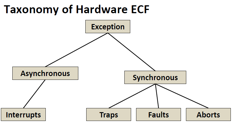 这些事件不能指望应用程序的开发者来解决(应用程序的开发者只负责开发正常的程序控制流),而这应该是 OS 需要处理的事情。为了高效处理以上在执行程序中出现的或意外、或故意的系统级状态变更的情况,OS 有一套策略:异常控制流(Exception control flow,简称 ECF)来处理上述情况,这样很多事件就无需应用开发者来考虑了。
