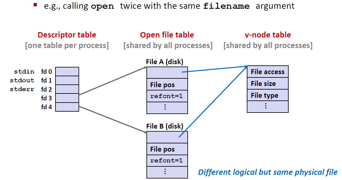 存在两个 Open File Table 它们指向同一个物理文件(也就是同一个 v-Node Table),但他们本身不一定完全相同,因为它们的字段