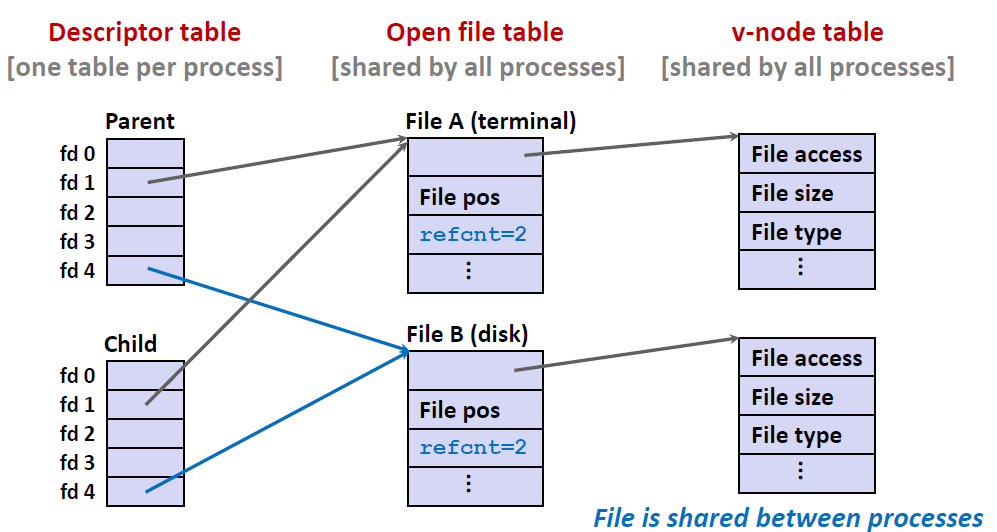 因此我们得知,父子进程共享的不是物理文件,而是 Open File Tables(共用了文件指针);这意味着父子进程任意一方读写文件,二者的文件指针一起变化;