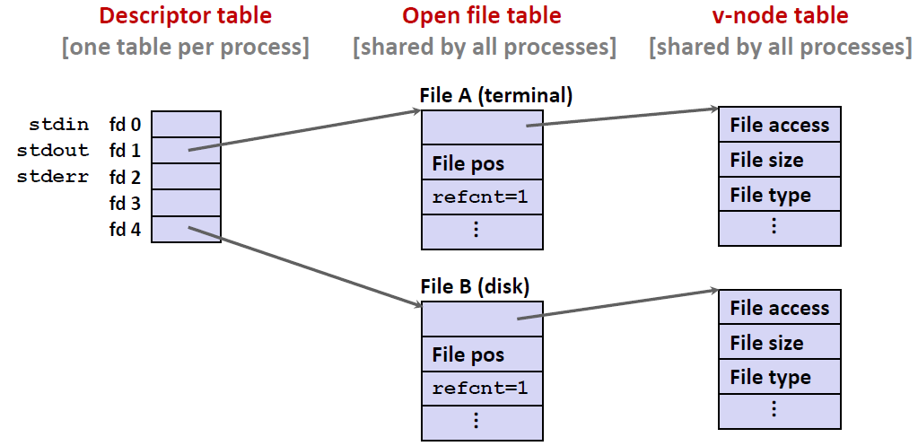 stat结构体的表,每个 v-Node Table 与物理存储器上的文件一一对应(双射),无论文件是否被打开;Descriptor Table 各个 entry 的内容存放的是指向各个 Open File Table 的指针,也表示当前进程已打开但未关闭的文件。而描述符相当于是对 Descriptor Table 的索引;