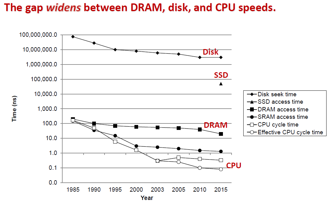 SRAM 访问 8 bytes 数据平均需要 4 ns,DRAM 需要 60 ns,而机械磁盘比 SRAM 慢 40000 倍,比 DRAM 慢 2500 倍;