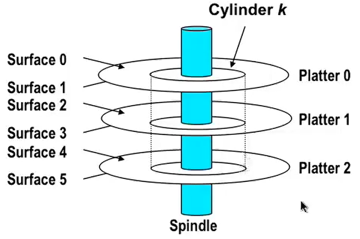 盘片轴(spindle)连接一系列盘片,每个盘片相同位置对齐的磁道称为 Aligned tracks,在垂直方向组成一个圆柱,这个相同位置的磁道所组成的元素称为 柱面,数据按照不同柱面进行存储,同一柱面的数据连续(为啥按柱面存?因为方便机械臂访问)。