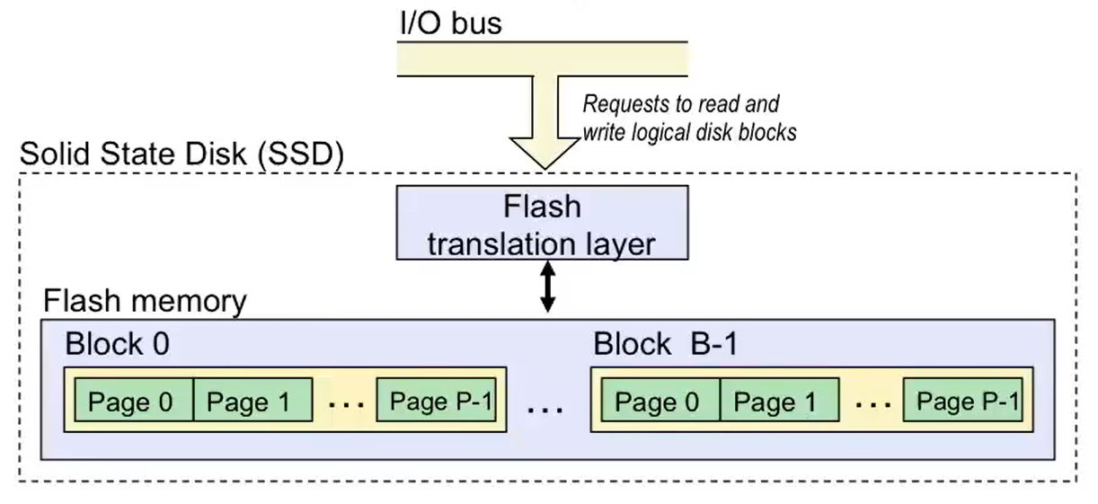 数据在 SSD 中是以 页(page) 为单位从闪存中读取和写入的。页的大小 512 KB ~ 4 KB,块(block,和之前提到的 CPU 所认为的逻辑块不同,下面解释)一般包含 32 ~ 128 页,取决于 SSD 实现的技术;