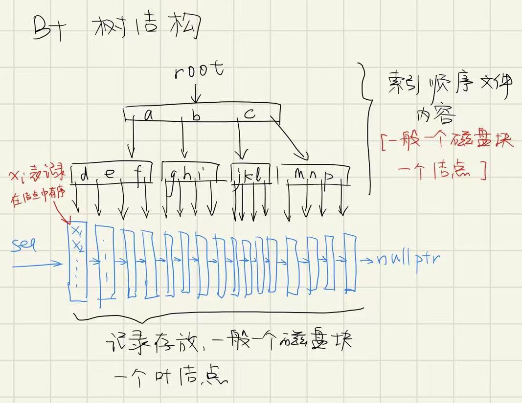 叶结点包含数据块(为了访问结点的效率,一个数据块的大小应该设计为一个磁盘块的大小,使得机器在一次 I/O 读写就能完全将内容读进内存),其中存放若干记录(键-值对),同时叶结点按序连成单链表;