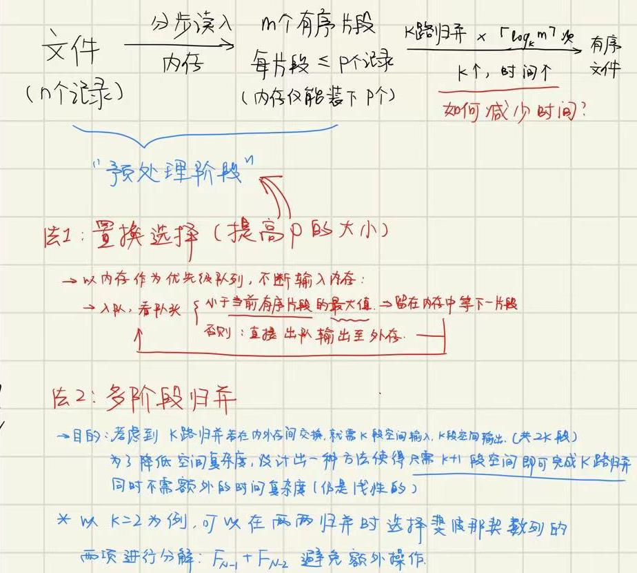 ⚠易错警示:如果题目说:”多阶段归并是为了最大限定地提高归并的路数“是正确的。不是说多阶段归并本身能提高归并路数,是因为多阶段归并能够提高”路“的利用率(对k路,总路数2k降为k+1),这样在同样大小的内存中,可以选取更大的k值。所以多阶段归并的目的也可以说成(在一定的资源条件下)为了最大限度地提高归并的路数;