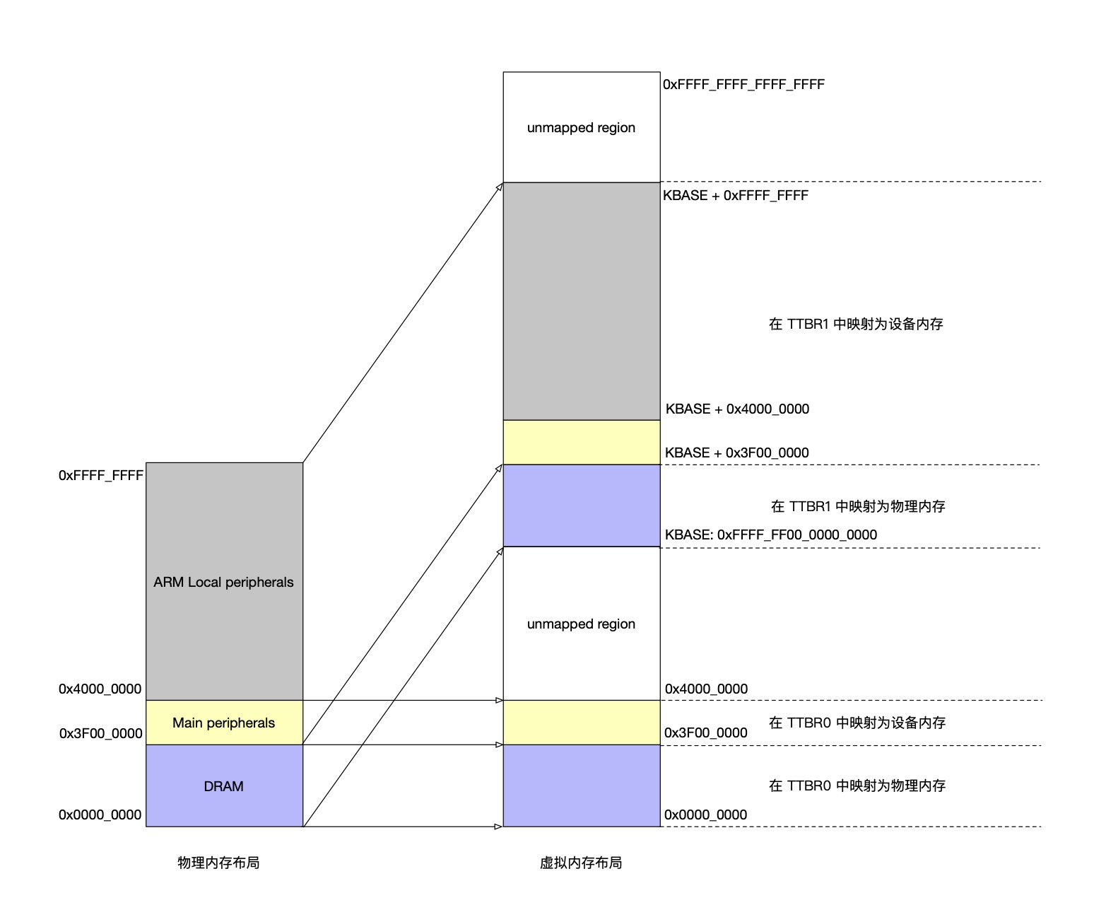 TTBR1),使用大页完成映射(如果 page size 是 4K,则采用 1G 大页,主要看具体实现)。此时只能叫映射,不能叫分配。