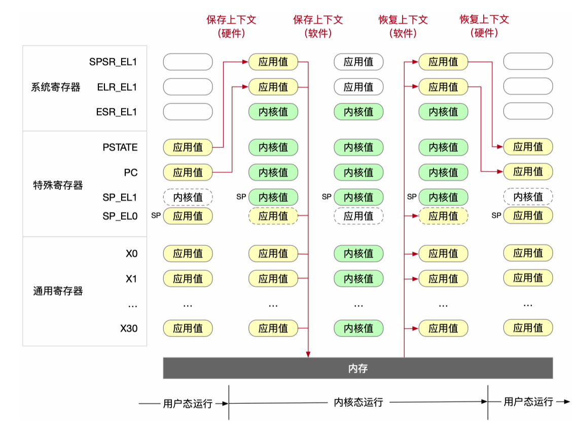 ELR_EL1方便返回当前用户态进程(和 x86 相同,如果是软中断则保存中断位置下一条指令的地址,如果是硬中断则保存中断位置当前指令地址)、特殊寄存器 PSTATE 保存到SPSR_EL1方便恢复当前用户态进程程序状态;写入系统寄存器