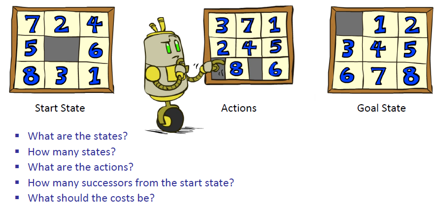 - successor function: roads (go to adjacent cities with cost (可以是距离、交通情况等));