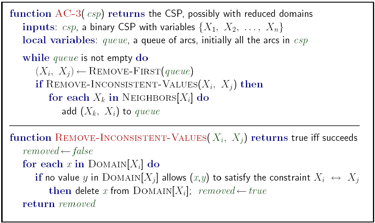 REMOVE-INCONSISTENT-VALUES); - 重复第 2 步直至队列中没有边(所有边都通过了一致性检查,又或者至少有一条边的定义域为空,即当前指派无解);