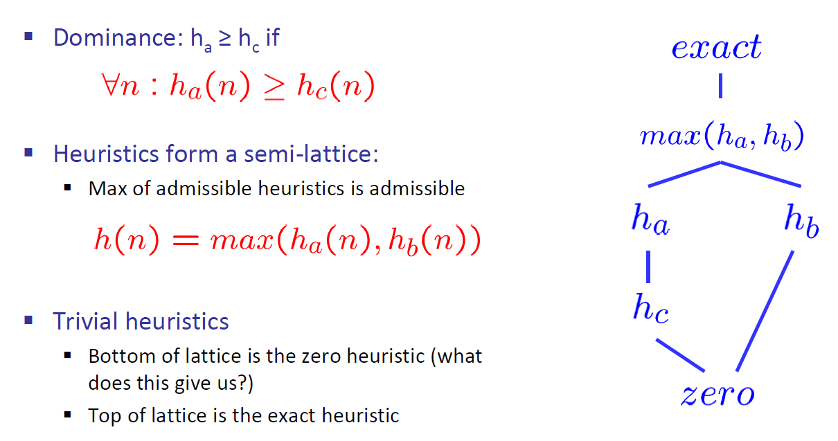 - The pac-man game(去往特定的有食物的地点):“距离”(heuristic function)可以是与终点的欧式距离、曼哈顿距离(因为上下左右移动);