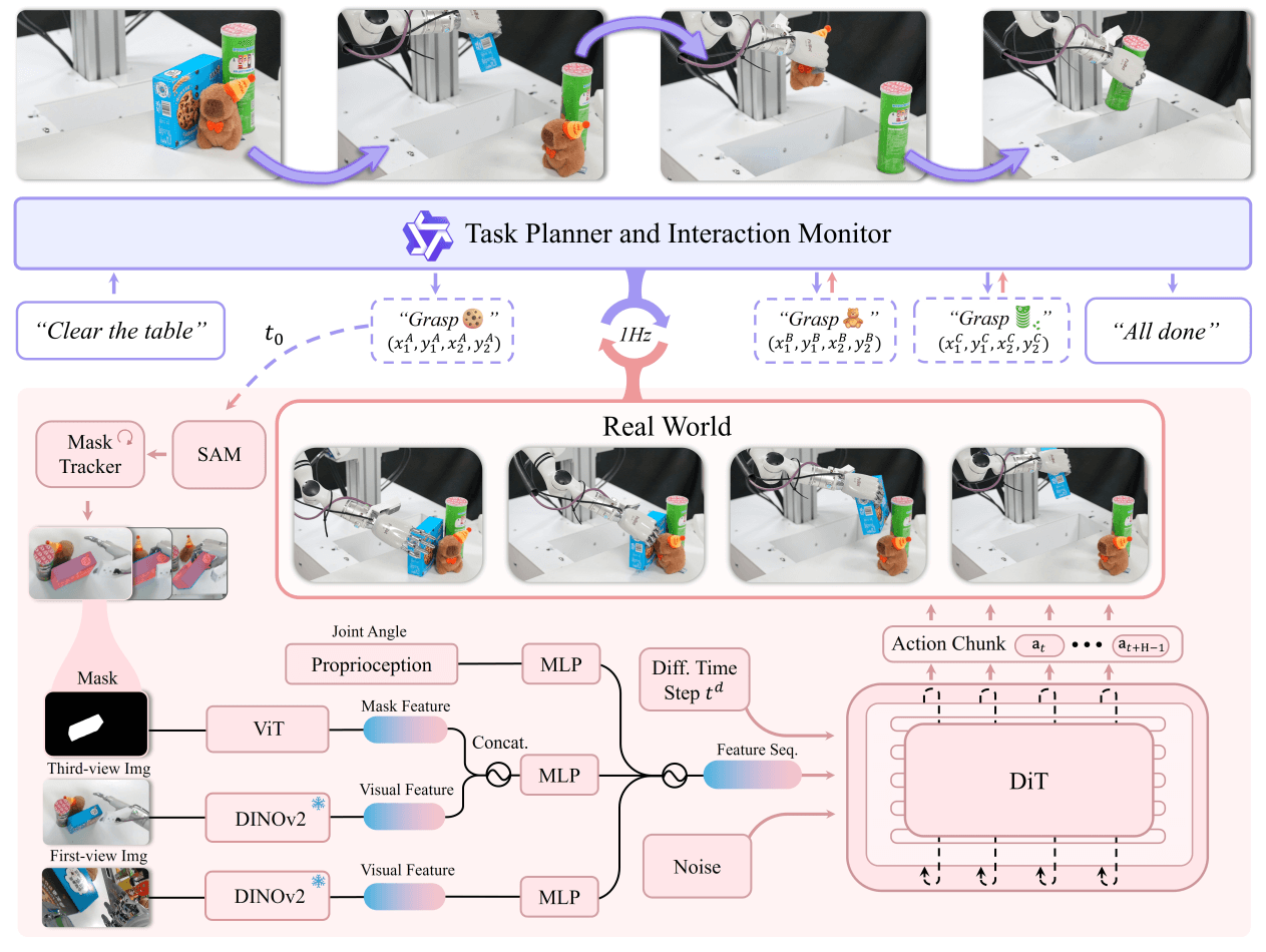 - 低层控制器(Controller):基于扩散模型的动作控制器,负责生成闭环的动作序列。控制器通过分割模型(如 SAM 和 Cutie)获取目标物体的掩码(Mask),并使用预训练的视觉编码器(如 DINOv2)提取图像特征。这些特征与机器人本体感知状态(Proprioception)结合,通过扩散模型生成多步动作序列。