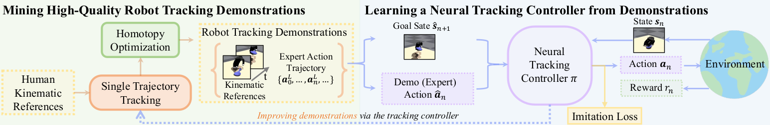 在 RL 训练的同时引入监督信号来降低 policy 学习的难度。通过交替地使用高质量的轨迹跟踪数据辅助通用轨迹跟踪控制器的学习,以及借助通用轨迹跟踪器来提高单一轨迹跟踪演示的质量;