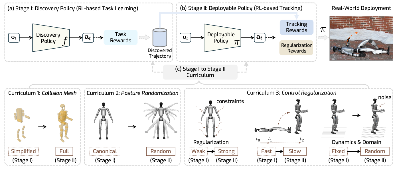 Stage II is optimized to track the state trajectory discovered in the first stage to tackle easier motion tracking with dense tracking rewards, which is under strict Sim2Real control regularization for ensuring Sim2Real transfer. From Stage I to Stage II, we employ a Sim2Real learning curriculum that progresses from simplified → full collision mesh, canonical → random initial lying posture, and weak to strong control regularization and domain randomization. This two-stage approach integrates a hard-to-easy task-solving curriculum with an easy-to-hard Sim2Real curriculum, both of which are crucial for successful learning, as demonstrated in our experiments.