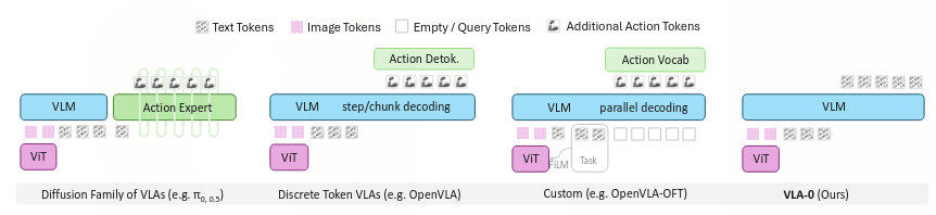 “将动作直接表示为文本” 这一最简单的策略被长期忽视(因直觉上认为 “文本不适合表示连续动作”),因此这个工作正是为验证该策略的有效性而提出 VLA-0。