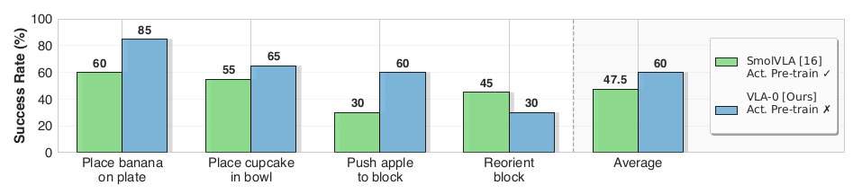 | 套件 | 测试能力 | VLA-0 成功率 | 最优 baseline(无预训练)成功率 |