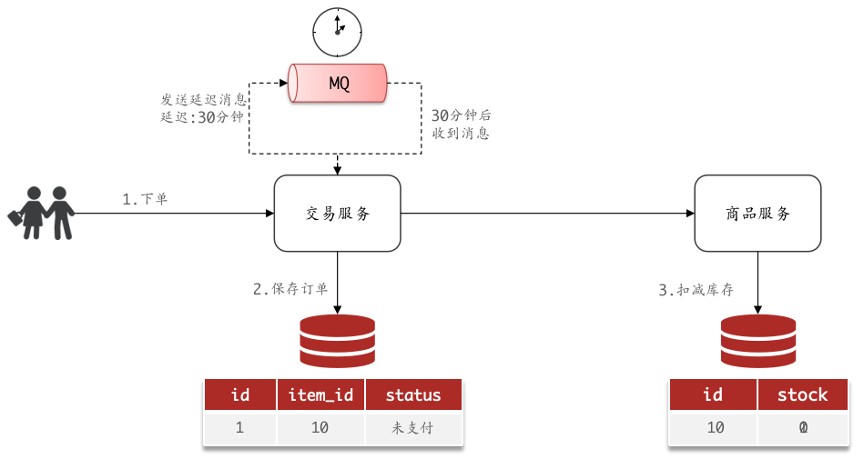 例如对于订单业务,如下图,如果在交易服务中的 “标记订单为已支付”,如果用户在支付成功后,“标记订单已支付” 以及完成,正在向 MQ 发送