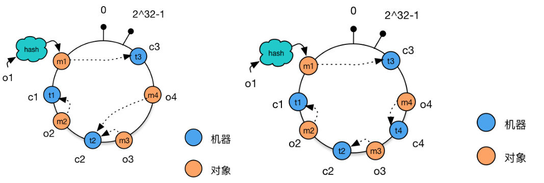 MAC/IP/HOSTNAME等信息)以及需要缓存的 KV 都 hash 到环上;于是就能判断信息究竟放在哪一台服务器上了:按顺时针方向,所有对象 hash 的位置距离最近的机器 hash 点就是要存的机器,如下图所示: