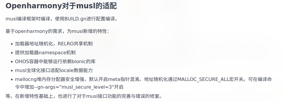 最后这一个坑我怀疑是 OpenHarmony 留给我们的。因为我发现 OpenHarmony 的 musl libc 和官方的 musl libc 是不同的,美其名曰 “安全特性”(参见官方 third_party_musl 仓库):