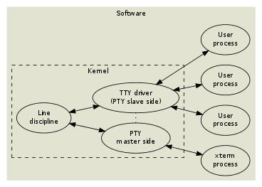 我们发现,line discipline、TTY driver 的结构都不需要变嘛,因为它们还需要提供基本的行缓冲、会话管理的功能。因此,人们在内核中设计出了 pseudo terminal(pty,伪终端),用于对接支持 xterm(Unix 中一种默认的终端模拟器)的桌面程序。