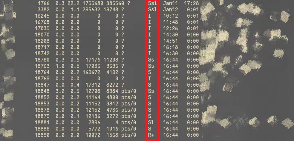 ps aux查看一下当前进程的状况,比如:中间红框的一列描述的就是各个进程的状态。其中可能出现的