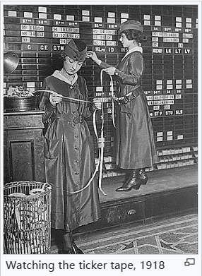 在 1869 年,一种机器叫做 “股票行情自动收录器”(stock ticker)在当时金融系统不断发展的资本主义世界诞生了。它的样貌可以描述一下——一个电驱动的机械装置,包含一台机械打字机(typewriter)、一捆的电线,还有一长串用以打孔的纸带组成,它工作时的样貌如下图1: