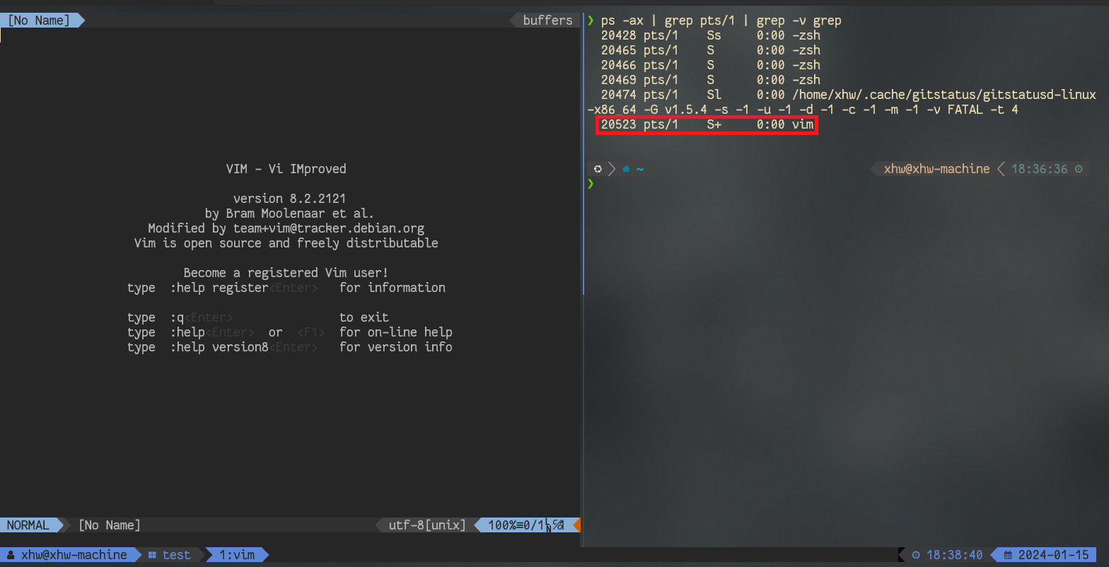 所以你会看到如下图,启动 vim 后,vim 进程所在组成为 foreground process group(进程状态 S+);而 shell(这里是 zsh)进程则由 Ss+ 转为 Ss(不再是前台进程,但仍是 session leader),并且它们都位于同一个 session 中(指向同一个 pts,即 pts/1):