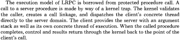 LRPC(software):reduce twofold copy(caller -> kernel -> callee) to one(caller -> shared memory);